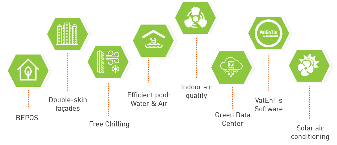 - Air quality : studies of the indoor and outdoor air quality in the building. PHOSPHORIS makes the environmental performance objectives of buildings compatible by acting on thermal comfort, ventilation and air purification.