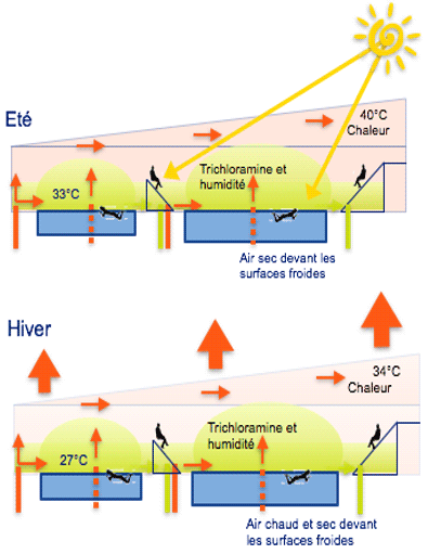 La trichloramine est difficilement perceptible par les usagers et de plus il n’existe pas d’instrument permettant de vérifier instantanément sa concentration. La solution d’injecter beaucoup d’air neuf dans la piscine et de le diluer n’est pas la meilleure, de plus se serait augmenter encore plus la consommation d’énergie thermique qui est déjà l’une des plus élevée. Tout tient dans l’efficacité de la distribution d’air : on se rapproche plus des solutions de déplacement d’air utilisées dans les salles d’opérations que celles de brassage d’air utilisées dans les salles polyvalentes. »