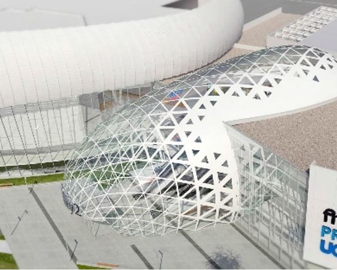 Centre existant restant en activité / Obligation de maintenir les accès du centre existant tout en construisant un parking extérieur / Construction d’une coque pour implantation d’un complexe cinématographique de 18 salles (10 000 m²) et coques pour restaurants (3 400 m²).