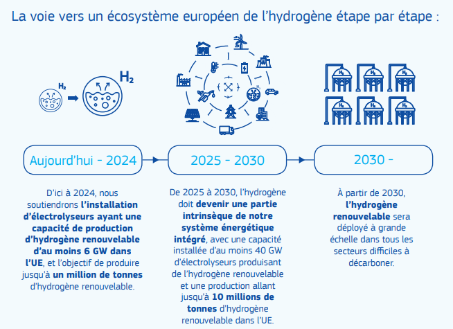 - 2025-2030 : l’hydrogène fait partie intégrante du système énergétique intégré, avec une production allant jusqu’à dix millions de tonnes d’hydrogène renouvelable dans l’UE;