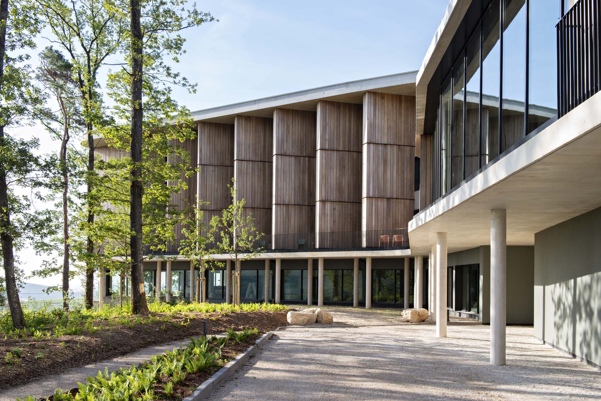 Ce projet de tourisme vinicole est situé dans le centre d’un parc naturel régional entre la région d’Epernay et la grande vallée. Il s’intègre totalement aux caractéristiques de son environnement. Les espaces recevant du public tels que les restaurants, bars ou hall de conférence, encerclent une terrasse qui amène la forêt dans le cœur du bâtiment. La partie logement de l’hôtel est divisée en 3 étages.
