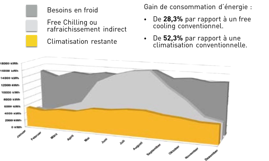 L’outil d’aide à la décision permet aussi la valorisation des solutions alternatives de maîtrise énergétique et de réduction de l’impact environnemental, comme le free chiling. Cette solution permet un gain de consommation d’énergie pouvant aller jusqu’à plus de la moitié d’une climatisation conventionnelle. D’autres approches possibles sont l’intégration des Data Centers dans des BEPOS (Bâtiment à Energie POSitive) ou des BEPAS (Bâtiment à Energie PASsive), voire des écoquartiers afin de valoriser leurs rejets continus de chaleur.