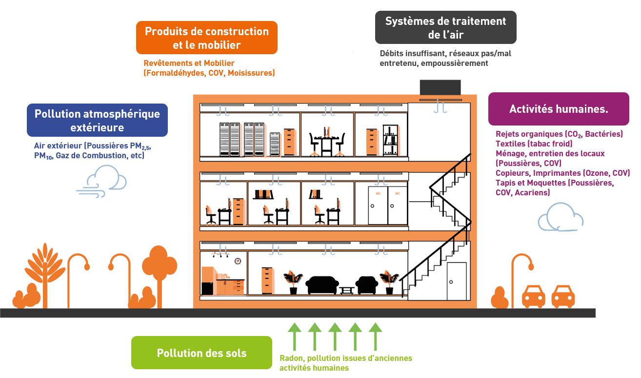 Pour prendre en compte la qualité de l’air dans un bâtiment, il faut étudier toutes les sources de pollutions à toutes les étapes de la vie d’un bâtiment afin d’agir pour limiter les émissions de polluants. Il existe 5 grands paramètres à prendre en compte en ce qui concerne la qualité de l’air intérieur d’un bâtiment quel qu’il soit :
